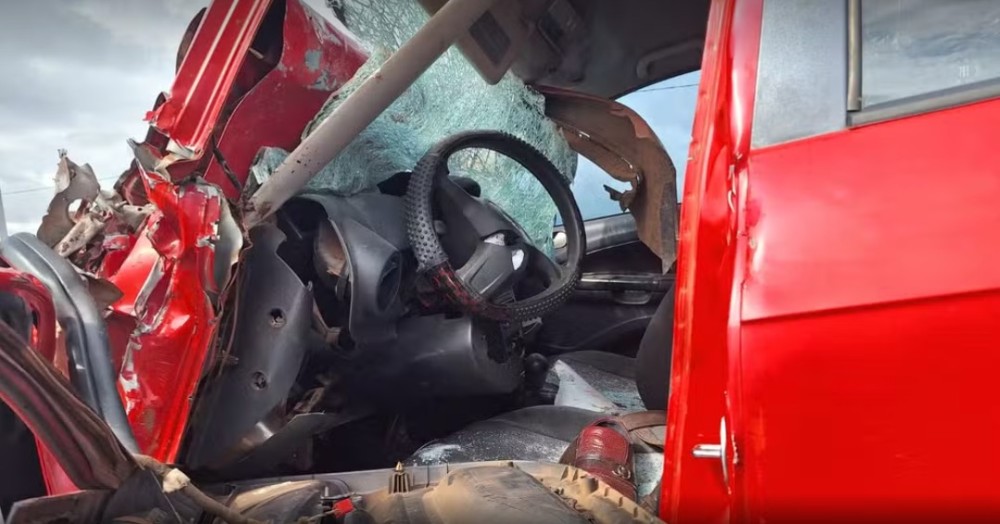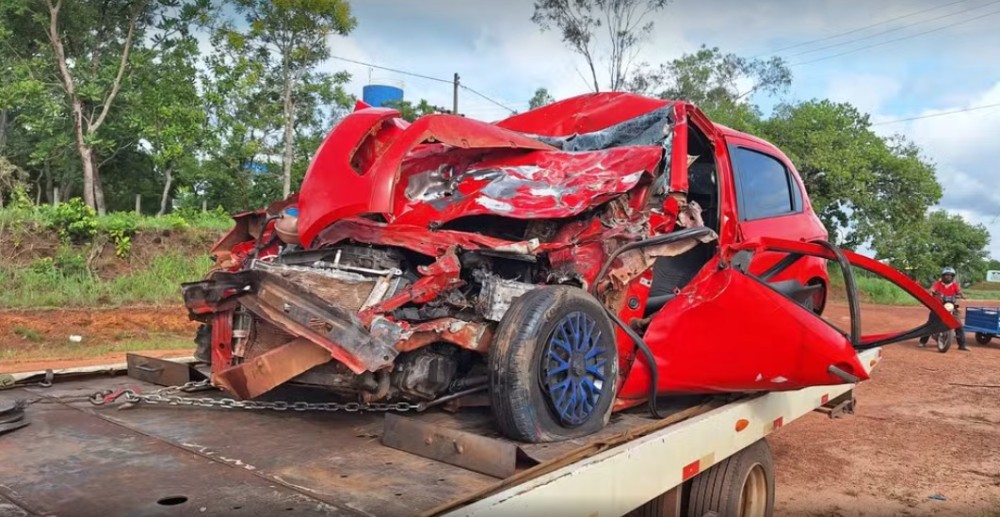 Fotos feitas no local mostram o carro de passeio completamente destruído. Não há informações sobre passageiros feridos.