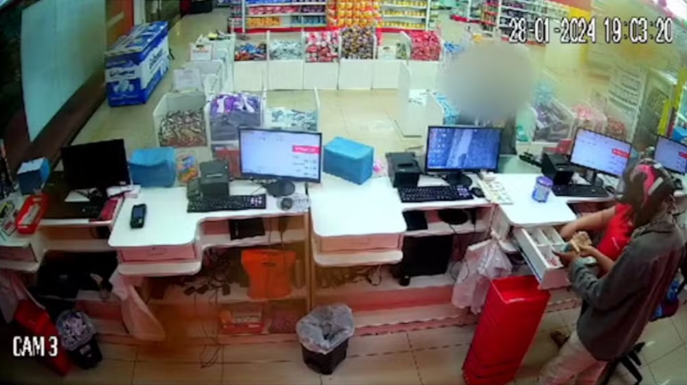 As câmeras de segurança da farmácia também flagraram o monento em que homem com capacete na cabeça, dá a volta no balcão e rende a atendente. Ela esvazia o caixa e entrega o dinheiro ao homem, ele sai e dá de cara com os policiais, momento em que a perseguição começa.